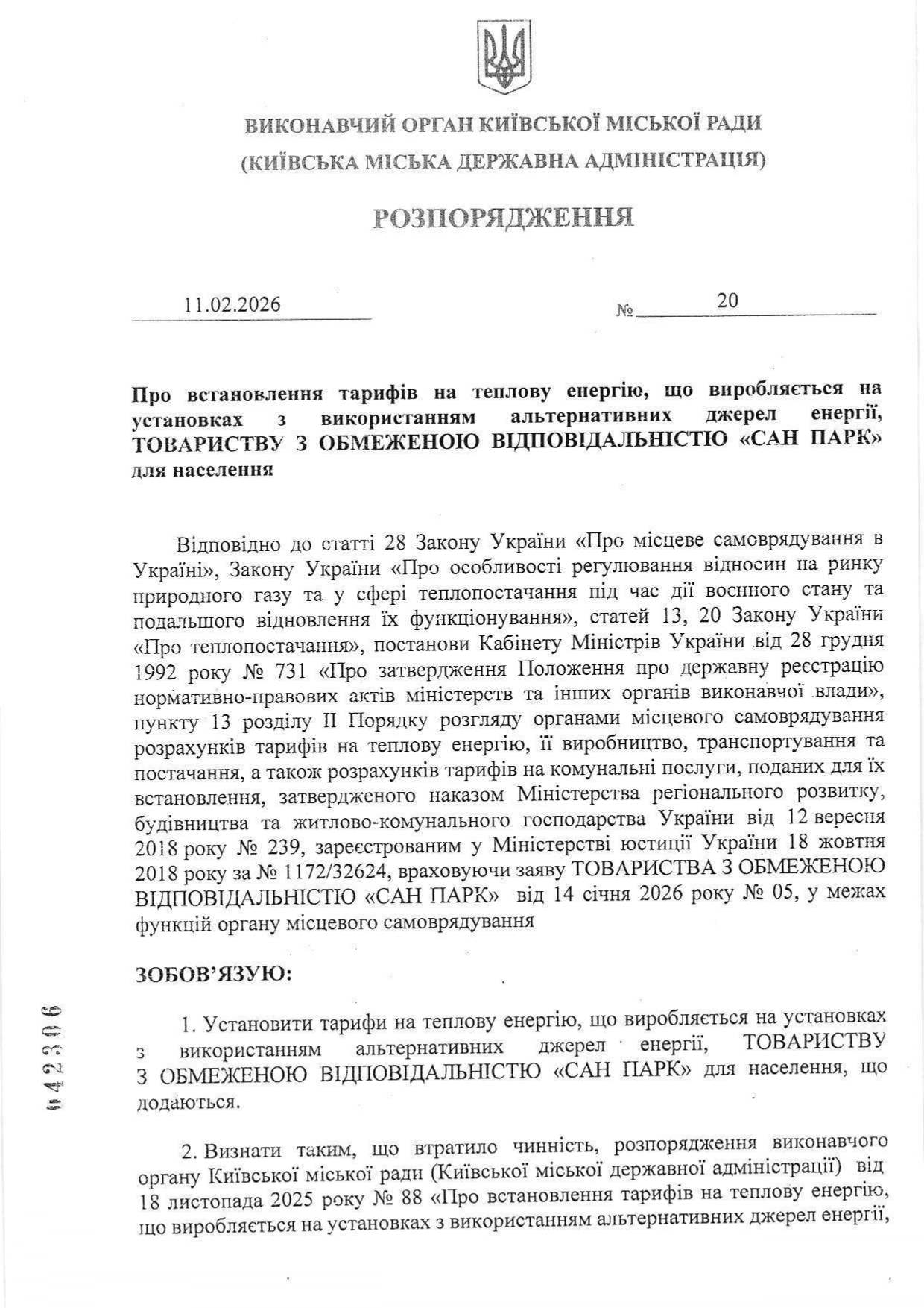 Розпорядженням виконавчого органу Київської міської ради (Київської міської державної адміністрації) від 11.11.2016 №1121 «Про встановлення тарифів на теплову енергію, транспортування теплової енергії, постачання теплової енергії та на послугу з централізованого опалення ТОВАРИСТВУ З ОБМЕЖЕНОЮ ВІДПОВІДАЛЬНІСТЮ «САН ПАРК» встановлені тарифи для населення та інших споживачів на: