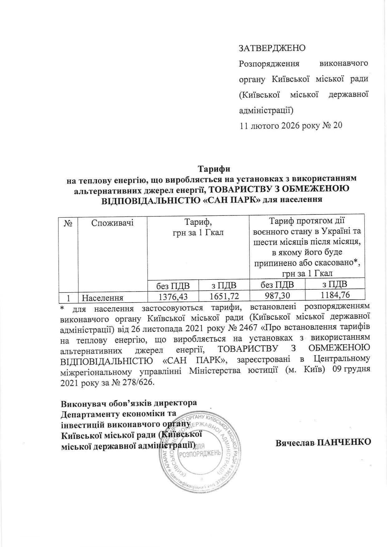 У відповідності до листа ДЕПАРТАМЕТУ ЕКОНОМІКИ ТА ІНВЕСТИЦІЙ № 050121-6150 ВІД 19 ЖОВТНЯ 2021 РОКУ «Про розгляд розрахункових документів щодо встановлення тарифів на теплову енергію» з 01 листопада 2021р .ТОВ «САН ПАРК» встановлено тариф для населення на теплову енергію, що виробляється на установках з використанням альтернативних джерел енергії у розмірі 1184,76 грн ( з ПДВ).