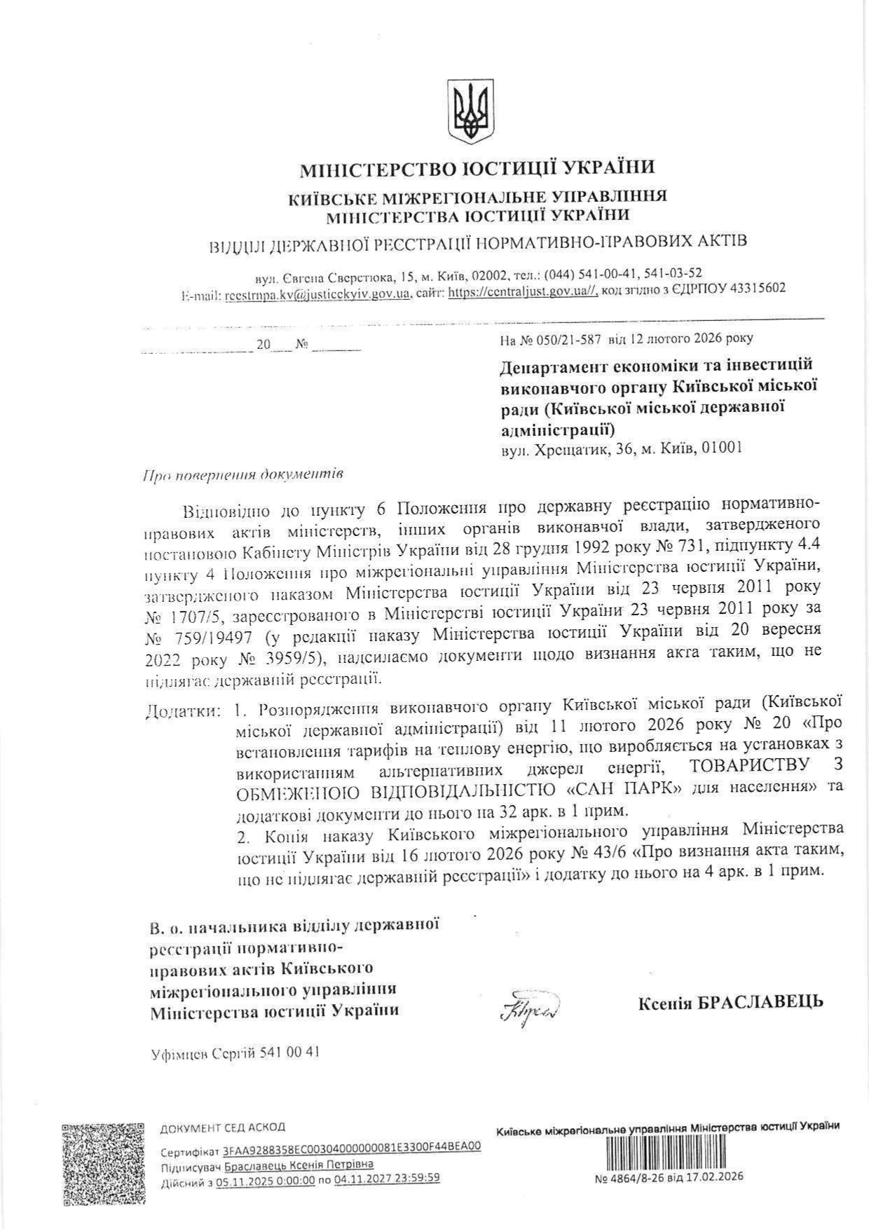 - теплову енергію ТОВ «САН ПАРК» (зареєстровано 24.11.2016р. в ГТУЮ у місті Києві за №241/1554):